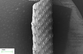 Descrição: zoécios eretos, bilamelares com zoécios retangulares (figura a). Parede frontal granulosa, convexa com poros areolares. Perístoma desenvolvido na parte proximal e provido de 2 pequenas aviculárias latero-distais características da espécie (figura b). Aviculários interzoeciais maiores com opérculos com extremidade distal assimétrica sinuosa. Gonozoécio maior e disposto na série dos autozoécios com poros medianos regulares e orifício transversal.